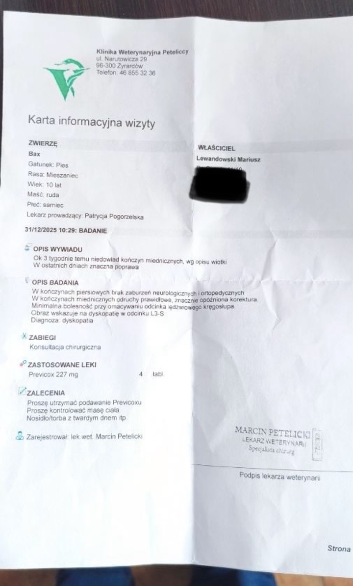 Diagnoza ortopedy była bolesna – dyskopatia. Choroba, która odebrała mu sprawność i swobodę ruchu. Od tamtej pory Bagsik jest nieustannie leczony farmakologicznie, przechodzi kolejne wizyty i badania. Mimo podawanych leków jego stan jest bardzo ciężki. Nie chodzi. Każdy ruch sprawia mu trudność.