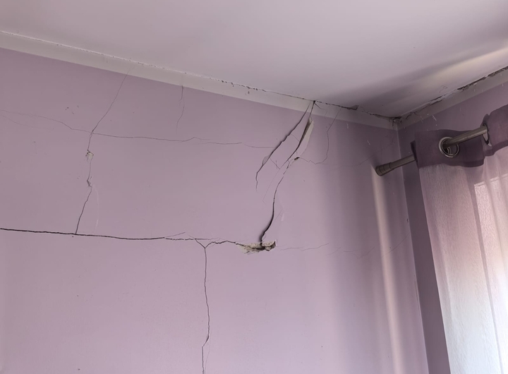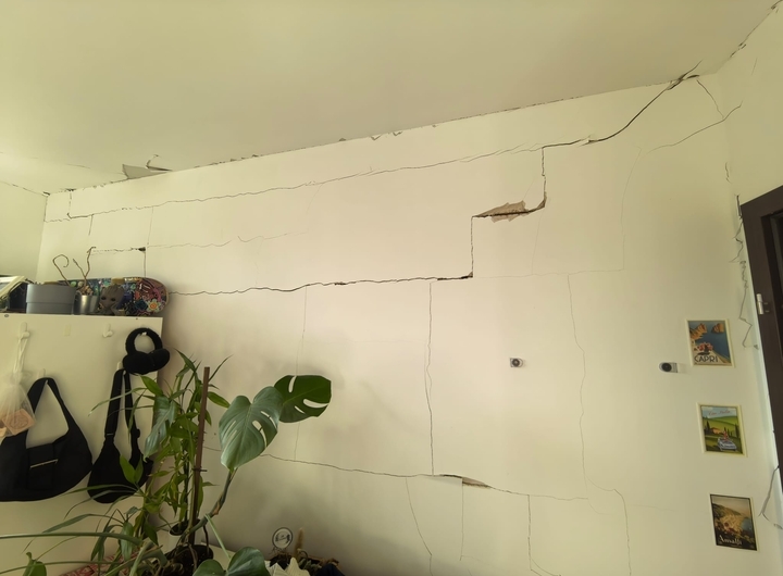 Uszkodzony został również dach — belki wymagają naprawy i uzupełnienia, a całe wykończenie pokoju musi zostać wykonane ponownie: stelaże, regipsy, konstrukcje.